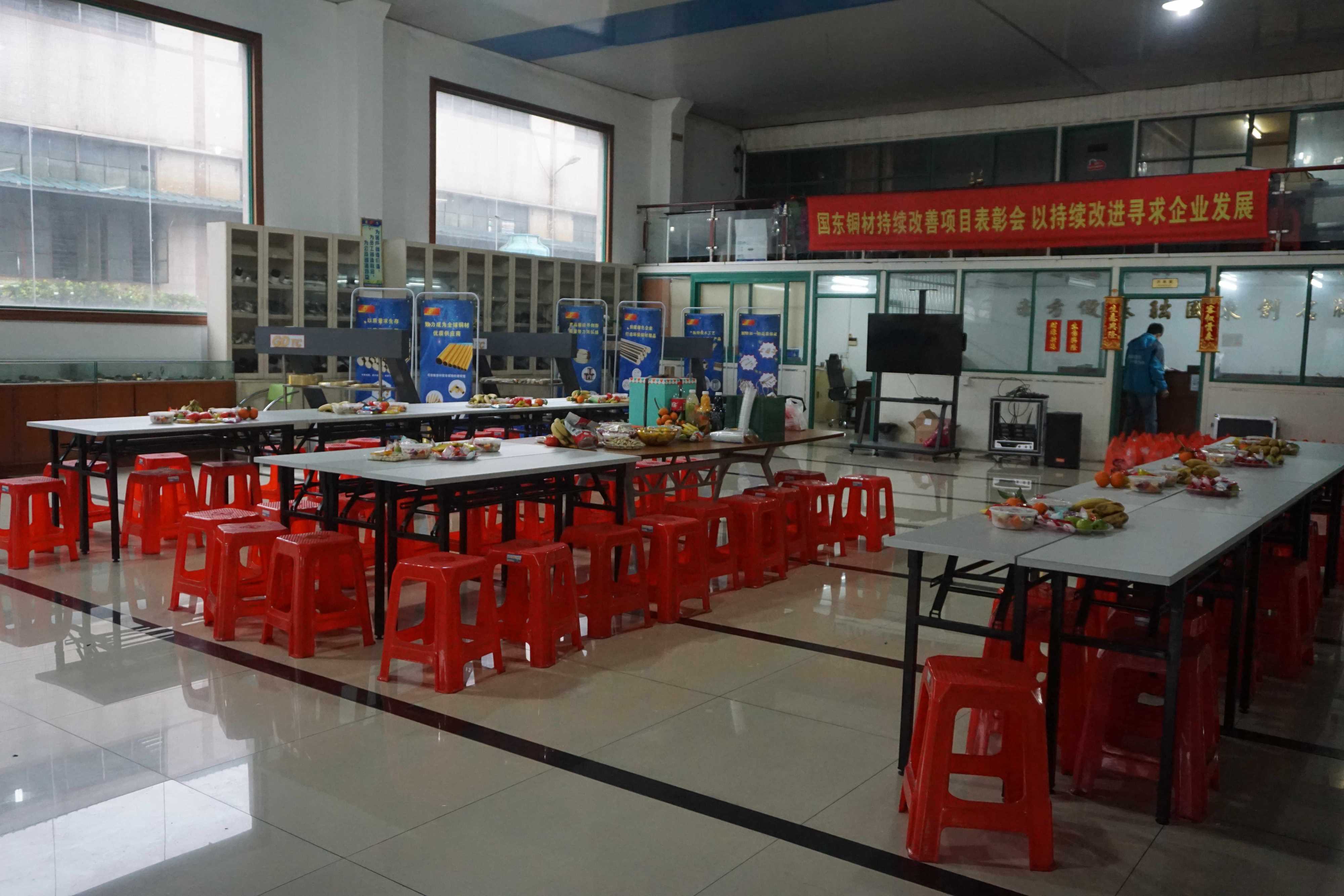 下午13:00分,由行政部同事、TC成員一起合力在辦公樓一樓大廳開始布置會場擺好桌臺,洗切水果做果盤、擺放零食、擺放禮品和鮮花,一切提前準備就緒。